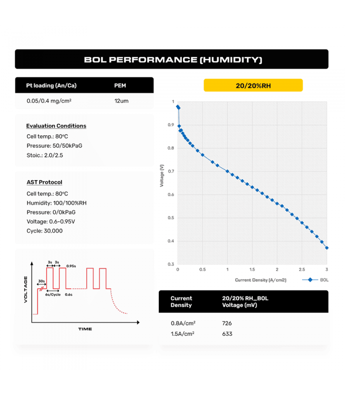 • Beginning-of-Life (BOL) Voltage at 0.8A/cm2 Current Density: 726mV