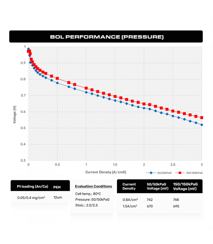 • Beginning-of-Life (BOL) Voltage at 1.5A/cm2 Current Density: 695mV